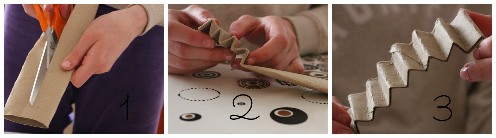 4. En kuvannut tästä sen enempää kuvia, mutta pujota pallon läpi pahvisia suikaleita. Niitä saat esim. leikkaamalla äskeisen kollaasin rinkuloita kahtia.