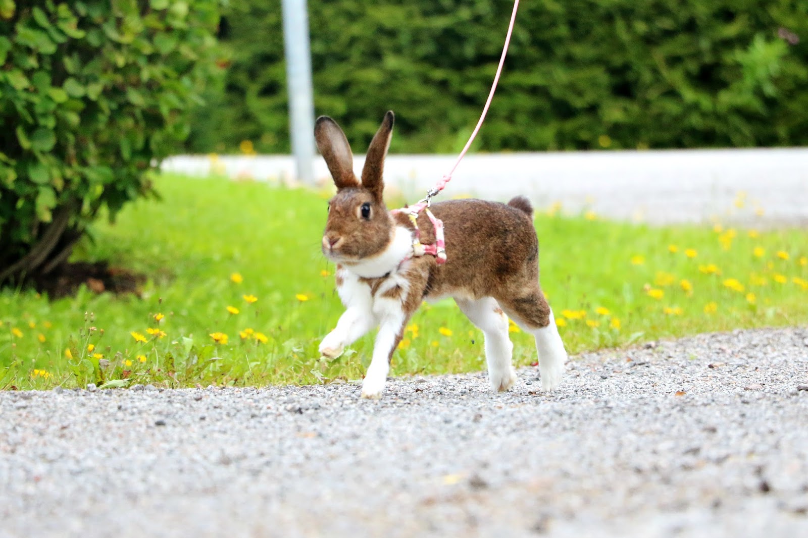 Kesäisin kanit ovat siis yleensä päivät aitauksissa, mutta sen lisäksi annetaan yleensä jokaisen kanin juosta valjaissa joka päivä ainakin kerran.